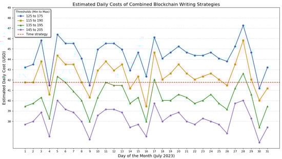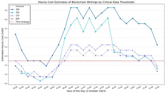 Our approach significantly mitigates the high costs typically associated with on-chain storage of large data volumes. In our system, only a 32-byte hash is written to the blockchain; hence, recording a fixed-length hash incurs only a small fraction of the cost required for storing complete data records. The experimental results confirm that transaction fees for hash writing operations remain low even under variable gas prices. These findings highlight the inherent trade-offs between predictability, cost-efficiency, and adaptability. The time-based strategy ensures a consistent recording schedule but may result in redundant blockchain interactions. Conversely, the threshold-based approach offers greater adaptability but introduces variability in update timing. The combined strategy, particularly with the 145–205 configuration, demonstrates an optimal balance, achieving cost savings while maintaining responsiveness to fluctuations in critical data volume.