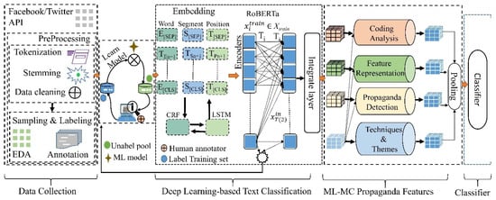 Figure 1 illustrates the complete propaganda detection pipeline, detailing each stage from data collection and pre-processing to classification and final integration. This pipeline represents a cohesive and systematic approach, showcasing the interplay between novel algorithmic designs, advanced embeddings, and robust classification strategies. By focusing on these three phases, our methodology demonstrates its innovative contributions to propaganda detection, emphasizing the integration of cutting-edge DL models, sophisticated data processing, and a well-structured classification framework. This approach directly addresses the limitations of existing methods, offering a significant advancement in the field.