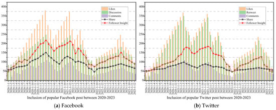 The ProText dataset was constructed by leveraging publicly available information from social media platforms through both manual collection from Facebook and the use of the Twitter standard search API. These techniques were applied to social media discussions using specific search phrases combined with ProText [,,]. The popularity of the ProText collection was gauged based on public engagement metrics, such as posts with the highest number of likes, shares, and discussions, or popular tweets, spanning from January 2020 to 2023.