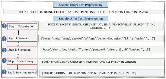 - Uysal, A.K.; Gunal, S. The impact of preprocessing on text classification. Inf. Process. Manag. 2014, 50, 104–112. [Google Scholar] [CrossRef]