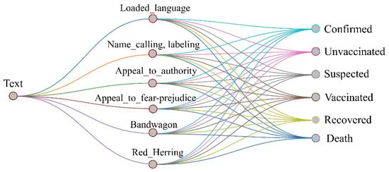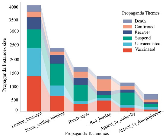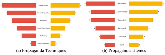 This stage focuses on curating a high-quality labeled dataset essential for training and evaluating the propaganda detection model. During the annotation process, annotators identified example records with preconceived notions []. Consequently, pre-processing the annotated COVID-19 dataset was essential to ensure its high quality and suitability for developing innovative models. The propaganda-related data were categorized into six classes—Loaded_language, Name_calling, Labeling, Bandwagon, Red_herring, Appeal_to_authority, and Appeal_to_fear-prejudice—along with six themes—suspected, confirmed, recovered, deceased, vaccinated, and unvaccinated—as illustrated in Figure 4.