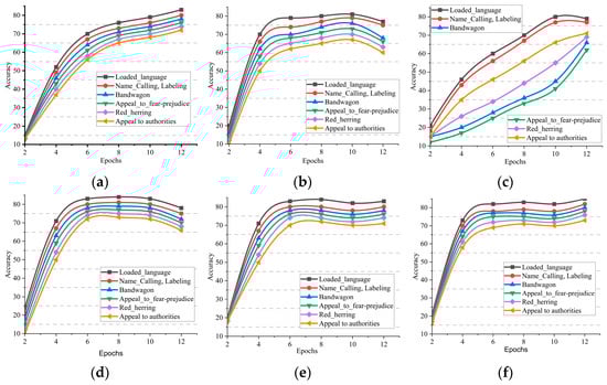 Recent advances in DL have greatly enhanced propaganda detection capabilities. Studies employing BERT-based models have demonstrated superior performance by integrating multiple token features into hybrid models [,,,]. Embedding techniques like Word2Vec and FastText have been applied to benchmark CNN, RNN, and BERT models []. Notably, this study pioneers a novel method that examines both information features and propaganda themes, offering comprehensive insights into the dynamic interactions within DL models.