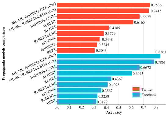 Detecting propaganda is an inherently complex natural language processing (NLP) task. Existing deep learning (DL)-based approaches have made significant progress, employing methods such as sentence-level classification for news articles, tweets, and public discussions [,,]. However, the professional and convincing nature of propaganda posts presents ongoing challenges. Many current DL models struggle to accurately detect and interpret sophisticated propaganda designed to appear credible and persuasive [].