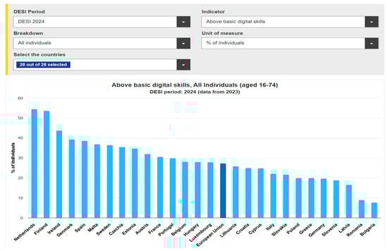 To conduct an analysis to assess the current level of digital development of EU countries, we used the Digital Decade DESI visualization tool [24] developed and offered by the European Commission. This tool provides access to existing structured data on digital transformation in EU member states according to certain key dimensions. The software product developed by the European Commission is a set of visual and analytical tools with a convenient, intuitive interface that provides flexible access to regularly updated data.
