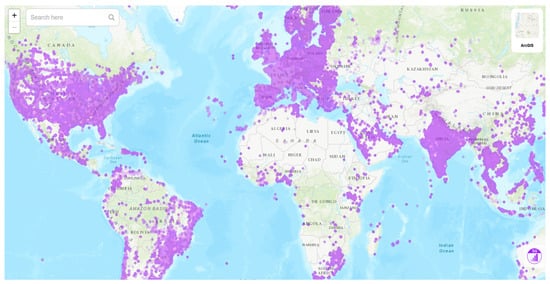 In five countries, we see 100% use of 5G technology, with six more in the range above 98%; the average value for the EU is also high (89.3%), but there are a few countries with low use, with the minimum value of 32.75% in Romania. It should be noted that the EU is actively working to expand 5G coverage on its territory; over the past year, it has increased by 10%. To obtain an idea of using 5G in the world as a whole, you can look at Figure 16 [25], where 5G coverage areas are shown in purple. The figure illustrates that the EU is one of the world leaders in using 5G technology.