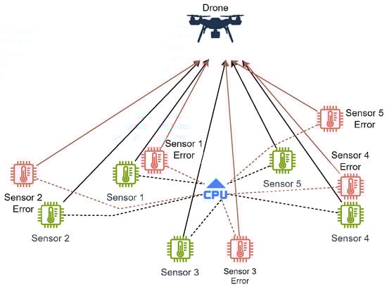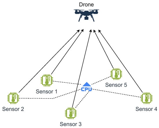 Figure 3. The system comprises multiple sensor nodes, represented as temperature sensors for illustrative purposes. These nodes are assumed to be coplanar, residing within a single plane. A Central Processing Unit (CPU) or an equivalent processing unit with a fixed and known position, is responsible for determining the absolute positions of the sensors within the simulation. However, the communication link between the sensors and the CPU is not explicitly modelled in this study. Instead, we focus on the cooperative communication between the sensors and a designated receiver—such as a drone, whose position is known—that captures the transmitted signals. Accurate time synchronization among sensors is essential for enabling effective cooperative beamforming. In this work, we assume that such synchronization has already been achieved using state-of-the-art techniques [