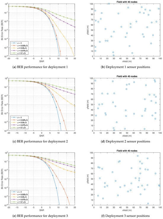 Figure 6 presents BER performance assuming a random Gaussian error in each sensor’s position, with the variance expressed as a function of the carrier wavelength. The case where the variance is zero represents the ideal scenario with no error in sensor position estimation. The performance gap between the ideally scenario (where sensor positions are accurately known) and the non-ideal cases widens as the SNR increases. This indicates that, in high-SNR conditions, performance can be severely degraded due to destructive beamforming caused by position errors. These differences highlight the importance of analyzing the sensor distribution before deploying a non-uniformly spaced WSN, as our objective is to minimize the transmitted power while maintaining a minimum SNR that satisfies the BER threshold through beamforming, ensuring reliable data reception.