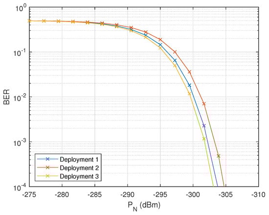 Figure 7, we present the BER performance for three different deployments. We assume that all sensors transmit at maximum power and that the drone is positioned at the center of the field. The results are plotted as a function of the noise power upon the receiver drone.