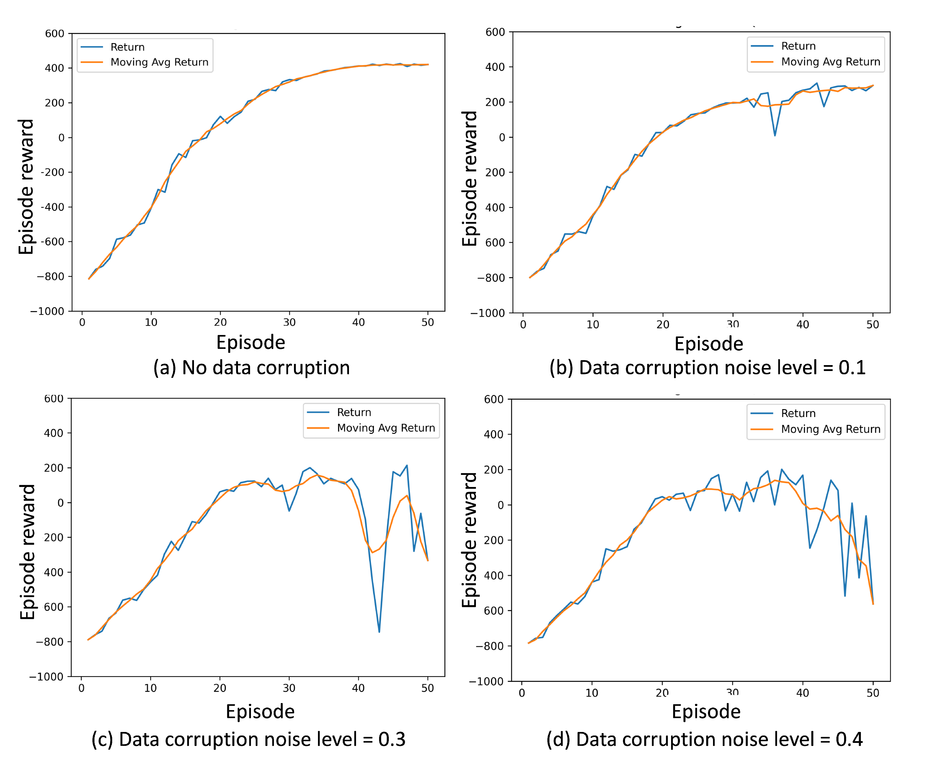 - Data Noise is More Detrimental than Missing Data: Our results demonstrate that noisy data are significantly more detrimental than missing data, leading to faster performance degradation and increased training instability. This was particularly evident in the reinforcement learning task, where inserting noise caused substantial fluctuations in both training and policy stability.