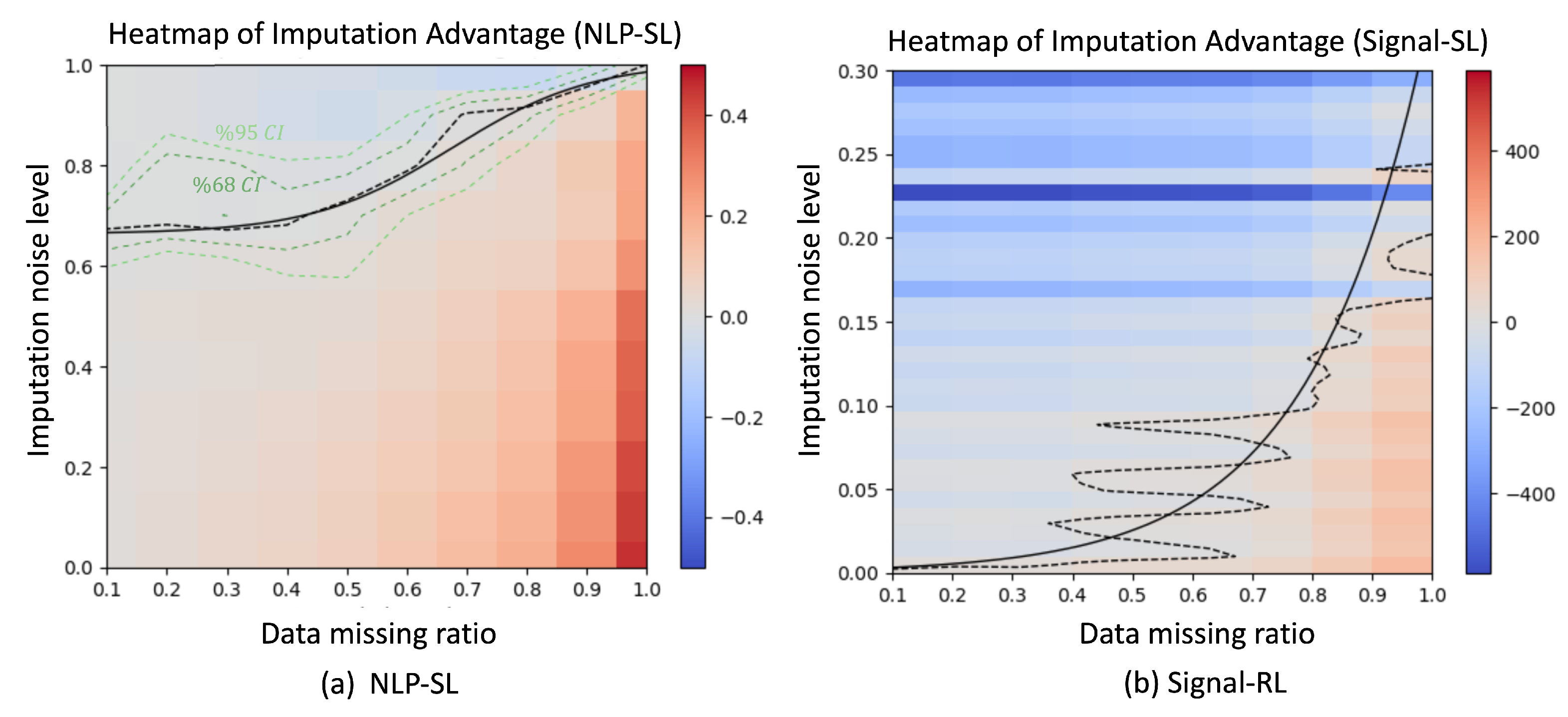 - Trade-offs in Data Imputation: Imputation methods can restore critical information for missing data but introduce a trade-off by potentially adding noise. The decision to impute depends on the imputation accuracy, the corruption ratio, and the nature of the task. The imputation advantage heatmap highlights two key regions: