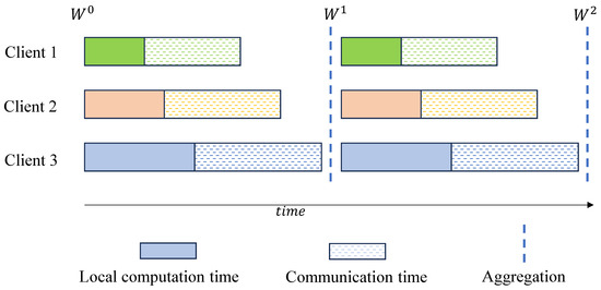 The first category involves introducing asynchronous or semi-asynchronous update mechanisms, whereby the cloud or edges are not required to wait for all slow clients to complete their local training before performing aggregation. This approach reduces latency associated with synchronization delays. For example, Wang et al. [6] proposed an asynchronous FL algorithm that allows clients to upload updates without global synchronization, significantly alleviating the bottleneck caused by straggling devices. However, asynchronous updates may introduce the problem of stale gradients, where model updates from slow clients are based on outdated global models, thus degrading convergence accuracy. To address this, some studies propose weighted asynchronous aggregation, dynamically adjusting each client’s contribution to the global model based on its computing capability, thereby mitigating the negative impact of delayed updates from low-resource clients [7,8].