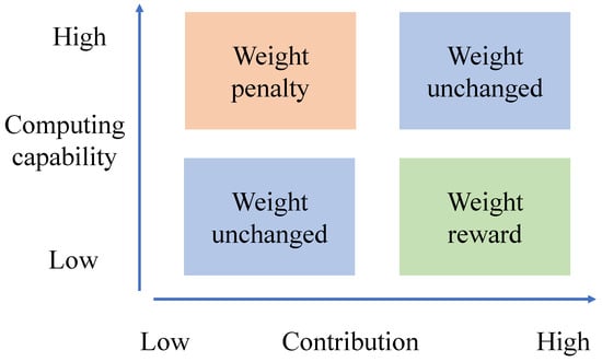 In the previous section, we grouped clients with similar computing capabilities into clusters, ensuring that the clients paired with each edge have similar computing capability. Through the dropout method, we also maintained consistent local iteration counts within each cluster, although the iteration counts differ between clusters. If we directly use the SV as the consideration for contribution weight, it may result in a loss of global model accuracy due to insufficient computing capability from originally high-contributing clients. Therefore, this section introduces a reward–punishment mechanism into the weights. Figure 3 presents a quadrant chart, where the horizontal axis represents client contribution and the vertical axis represents client computing resources. By calculating the contribution within each cluster (i.e., SV) and the average computing capability of each cluster, we can influence the weights. The specific explanation is as follows.