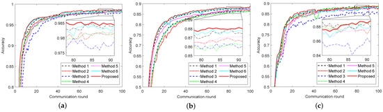Finally, an ablation experiment is conducted on the reward–penalty factor strategy, primarily comparing the scenarios of not using reward–penalty factors and using the reward–penalty factors in reverse (i.e., swapping and ). The results on the MNIST dataset are shown in Figure 6. It can be observed that the overall effect of using the reward–penalty factors is the best, while the methods of not using them and using them in reverse show slightly worse performance. The reason the method without reward–penalty factors performs slightly worse is that it fails to fully integrate heterogeneous computing capabilities into the contribution evaluation. Without this consideration, the performance is diminished in scenarios with heterogeneous clients.