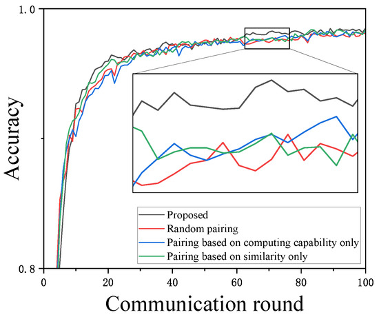 Comparision of the impact of different pairing methods on the global model accuracy using the MNIST dataset.