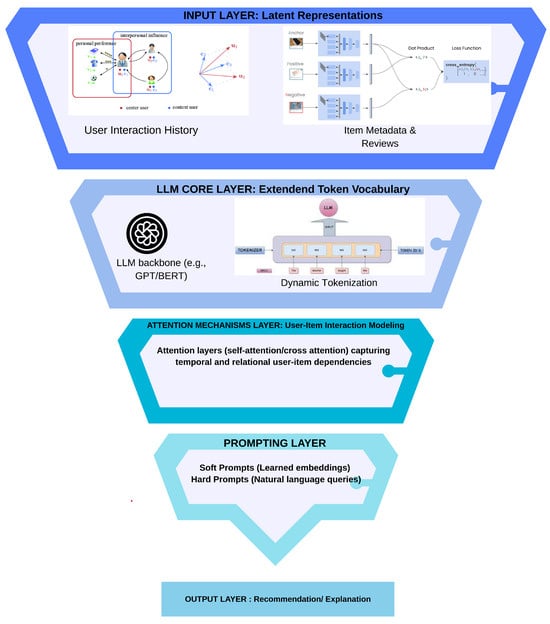 Recommendation systems [1,2] have become integral to user interaction across various domains, such as e-commerce, social media, healthcare, and education. These systems aim to deliver content tailored to user preferences, enhancing engagement and satisfaction. Traditionally, recommendation systems have relied on collaborative filtering, content-based filtering, or hybrid approaches. While effective, these techniques face challenges such as data sparsity, cold-start problems, and limited adaptability to rapidly changing user preferences [1,2]. The emergence of large language models (LLMs) has transformed natural language processing (NLP) by enabling sophisticated understanding, generation, and contextual reasoning. LLMs offer capabilities that extend beyond conventional systems by processing unstructured data like reviews, social media posts, and user feedback [3]. By integrating LLMs with recommendation systems (LLM4Rec), contextual awareness and generative capabilities can significantly enhance personalization and relevance. These advancements allow recommendation systems to implement the following: