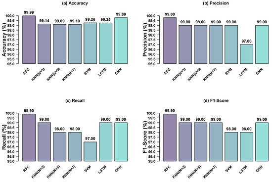 The F1-score followed similar trends with RFC scoring 99.90%, followed by CNN and KNN = (K = 3, 5, 7) all at 99.00%. With 98.00%, LSTM and SVM showed rather lower F1-scores. More details, including heatmaps and full confusion matrix visualizations, are provided in Appendix A.