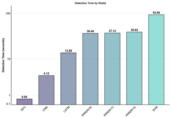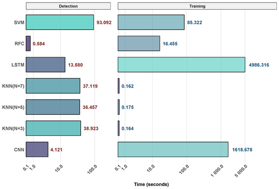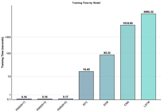 The training times required for each model are presented in Figure 3. Among the KNN variations, KNN (K = 7) needed just 0.162 s, KNN (K = 3) needed 0.164 s, and KNN (K = 5) required 0.175 s, thus demonstrating remarkable training efficiency. RFC was also relatively efficient during the training phase, requiring 16.455 s. By contrast, the DL models demanded considerably more computational resources during training. LSTM displayed the longest training time at 4986.316 s (about 83 min), while CNN required 1618.678 s (almost 27 min). Requiring 85.322 s, SVM positioned itself between traditional ML methods and DL approaches.