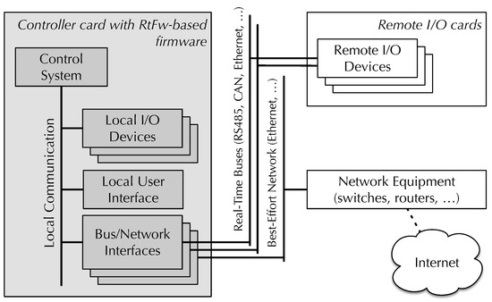 Figure 1 depicts the typical system architecture an RtFw system is built upon. With respect to [9], the figure has been redrawn to show that RtFw supports multiple real-time and best-effort buses and networks, and reflects the complete redesign of the Internet interface model. As shown in the figure, the main controller card that hosts the RtFw-based firmware is a microprocessor-based real-time embedded system, possibly connected to some local devices through an on-chip or on-board bus. Given that embedded system design has been shifting from a centralized towards a distributed I/O paradigm [40], RtFw also supports custom or commercial remote I/O cards, usually not based on RtFw, which the control system can reach via a serial RS-485 multidrop line, a CAN [39] bus, or an Ethernet network. CAN-based communication may be based on the Modbus-CAN protocol [41] or CANopen [42], while Modbus-TCP [43] is suitable for Ethernet. Legacy devices may be handled by means of Modbus-RTU [44] on RS-485. All these protocols are fully supported by multiple, readily available open and closed-source libraries, like [45,46,47].