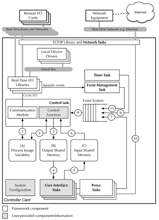 The timer task consists entirely of RtFw code. It makes use of a suitable RTOS timing primitive, vTaskDelayUntil in the case of FreeRTOS, to schedule its execution every control cycle period. This periodic schedule is then used to generate a stream of events that drives cyclic execution. The stream is conveyed to an event system through data flow ➇. The event system is responsible for collecting cyclic, as well as sporadic events, and delivering them to the control task by activating it whenever an event occurs. As explained previously, real-time networks, UI, and proxy tasks can notify the event system about the occurrence of a sporadic event as well, by means of data flows ⑪ and ➆, respectively.