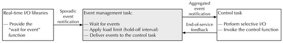 As shown in Figure 4, the event management task waits for events coming from one of the RtFw real-time I/O libraries. It then collects and aggregates them and eventually delivers them to the control task as event notifications through the main RtFw event system. In addition, the task maintains information on which remote I/O cards generated an event, and hence, need the attention of the control function, in each specific control function activation. The mechanism used by remote I/O cards to send an event is protocol-specific but, in any case, its implementation and peculiarities are kept hidden from RtFw by the corresponding I/O libraries. As an example, it may consist of event-driven PDOs in the case of CANopen [42] or an unsolicited message with a non-zero protocol identifier in the case of Modbus-CAN [41].