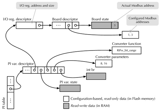 Figure 7 contains a simplified view of the data structures that RtFw synthesizes for input PI variable int br, declared as listed in Figure 6. Output PI variables are handled similarly. The tree-like data structure is rooted at the PI variables table, depicted at the bottom left of the figure. It has one element for each variable, which points to the description of the variable itself. Through a set of pointers, summarized near the top of the figure, RtFw can access other board-related data structures to retrieve the raw value of the variable from the device it resides on during the I phase of the control cycle. More specifically, the available information specifies which board the value comes from, as well as its bus address and registered address range.