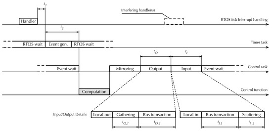 Although the handling of further sporadic events stops as soon as a cyclic event is inserted into Q—thanks to the prioritization mechanism discussed previously—the processing of the current sporadic event is allowed to complete before starting the next cycle. This event serialization approach simplifies synchronization within the control task and control function—because, in fact, there is no internal concurrency. However, it may introduce jitter at control cycle boundaries. Namely, the processing of the last sporadic event in the S phase of cycle k may delay the beginning of cycle . However, the amount of jitter is upper-bounded and, denoting the processing time of sporadic event i as , the upper bound is , regardless of the number of sporadic events in Q.