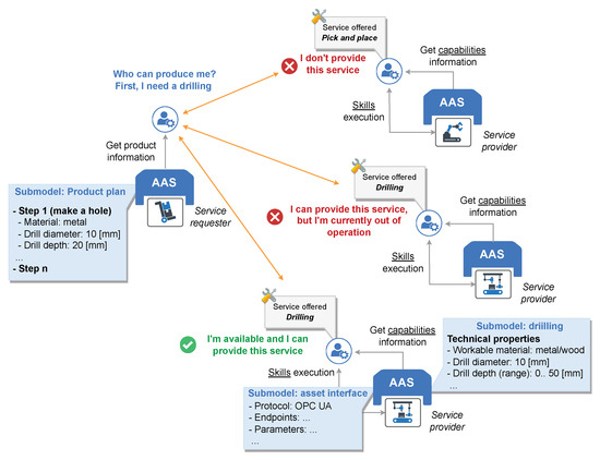 As shown in Figure 3, in a negotiation-based production scenario, information about capabilities (capability: an abstract description of a function or operation that an asset can perform, which results in tangible real-world effects, such as drilling. This description includes specific properties and constraints that define the scope and limitations of the operation [41]) and skills (skill: the concrete implementation of a function provided by an asset, as defined by a capability. A skill enables the practical execution of a capability and typically involves parameters, including inputs and outputs, that allow for the control and monitoring of the skill’s execution. Each skill must be accessible through at least one interface, which provides interaction with the skill’s state machine, as well as its parameters [41]) is organized into submodels, which the agents utilize to manage their respective assets. As a result, agents representing resources possess information of the capabilities their assets can provide and the skills to execute these capabilities. On the other hand, agents representing products possess information of their required capabilities structured in a submodel that outlines the steps and requirements for production based on the required capabilities. This information allows products and resources to collaborate seamlessly to complete the production process, where resources may act as service providers by offering their capabilities as services, while products act as service requesters, seeking services aligned with their production requirements.