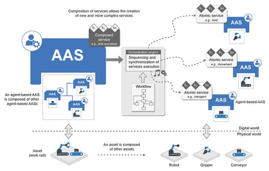 For example, consider an illustrative example of a work cell comprising a robot, a gripper, and a conveyor. Individually, their respective agent-based AAS expose atomic services such as movement, hold, and transport and are responsible for managing their own services. In this context, the agent-based AAS associated with the work cell contains an orchestration engine to coordinate the execution of these services, relying on effective communication and negotiation between agents to ensure proper sequencing and synchronization. Through this engine, the work cell agent can compose atomic services into a higher-level service, such as pick and place. Extending this concept further, a station agent can orchestrate multiple work cell agents, which in turn coordinate their assets, enabling the composition of complex production tasks to be executed efficiently and flexibly.