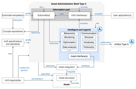 As shown in Figure 5, the defined reference model comprises two complementary parts: the information part and the intelligent part. The information part consists of a structured collection of submodels, which encapsulate detailed asset-specific information. These submodels provide a standardized knowledge base and serve as a comprehensive information source that supports agents in their decision-making processes and effective collaboration within industrial environments. On the other hand, the intelligent part is conceptualized as an agent that embodies the intelligent capabilities required for AAS Type 3. This agent is responsible for interpreting and processing the information stored in the submodels, making decisions, and executing appropriate actions. Moreover, it facilitates collaboration by communicating and negotiating with other agents, enabling decentralized coordination and adaptive behavior. In summary, the intelligent part goes beyond generic AAS requirements by integrating autonomous decision-making and agent-based collaboration capabilities, which are not formalized in existing AAS specifications but are essential for realizing the full vision of AAS Type 3.