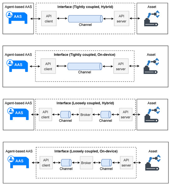 Another important aspect concerns the interface with physical assets for data collection or control adaptation. While the AAS provides I4.0-compliant interfaces to enable seamless data exchange at the information level, it is not inherently designed to interface directly with physical assets. Instead, this connection requires customized implementation tailored to the specific characteristics, communication protocols, and constraints of each asset. In this sense, agents (or well-known industrial agents) are suitable for this purpose, as they are primarily designed to interact with both the physical and digital layers. They can serve as intelligent intermediaries that interpret and process submodel data and translate high-level commands into asset-specific control actions, thus enabling flexible and autonomous monitoring and control of physical assets.