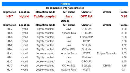 The recommended practice (“HT-7”) involves implementing a tightly coupled interface utilizing the OPC UA protocol. Due to hardware constraints preventing the hosting of agents on the asset, the suggested strategy relies on a hybrid location setup. This implies that the client operates remotely, potentially leading to response time being influenced by the communication infrastructure. If the asset is not capable of supporting the OPC UA protocol, other alternative interface practices can be considered, e.g., “HT-6” and “HT-3”, which consider Ethernet/IP and HTTP protocols, respectively. Based on these considerations, the agent can be designed and implemented in alignment with the characteristics of the recommended interface to meet the desired requirements.