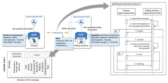 Finally, to illustrate how agents enable the communication capabilities of an AAS Type 3 solution, Figure 8 presents an example in which agents communicate using the FIPA request interaction protocol, adapted to comply with the I4.0 language guidelines using proper message structures and a shared vocabulary.