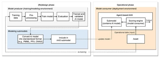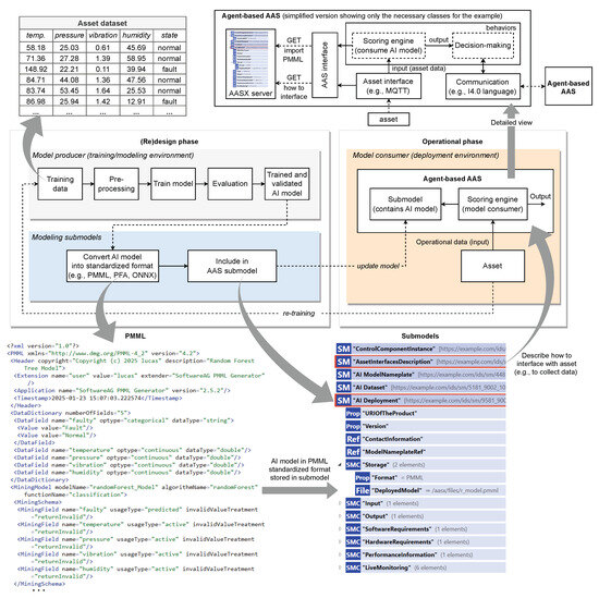 As illustrated in Figure 9, the agent-based AAS should act as a model consumer, where AI models developed in a training/modeling environment are deployed to the deployment/operational environment for execution. The (re)design phase encompasses two key steps: (i) the model producer (e.g., experts, systems, or tools) is responsible for developing, training, and validating AI models, and (ii) the modeling submodel handles the conversion and exportation of these models into standardized, machine-readable interchange formats, such as PMML, PFA or ONNX, for inclusion in appropriate submodels (e.g., AI Dataset [52], AI Model Nameplate [53], and AI Deployment [54], which describe the AI lifecycle). On the other hand, the operational phase involves deploying the AI models. During this phase, the model consumer, represented by the agent-based AAS, retrieves the AI models described in PMML, PFA, ONNX, or another standardized format from the designated submodels and executes them seamlessly.