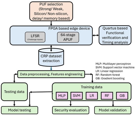 - Saleh, H.; Abulibdeh, E.; Naser, S.; Mohammad, B.; Alqutayri, M.; Muhaidat, S. Security Analysis of Digital-Based Physically Unclonable Functions: Dataset Generation, Machine Learning Modeling, and Correlation Analysis. Machine Learning Modeling, and Correlation Analysis. Available online: https://ssrn.com/abstract=4855555 (accessed on 9 June 2025).