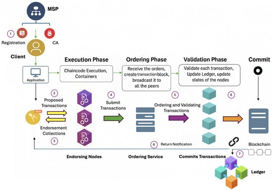 Utilizing chaincode, similar to Ethereum’s smart contracts and writable in Java, JavaScript, or Go, a consortium of companies can seamlessly coordinate their own blockchains within the framework []. Hyperledger Fabric’s intentional design emphasizes modularity, scalability, and versatility, forming a robust foundation for privacy, confidentiality, and scalability. In contrast to conventional blockchain approaches, its operational phases adhere to the “execute–order–validate” pattern, a strategic departure that enhances adaptability and effectiveness, aligning with trustworthy threat intelligence sharing in this context. This ensures transactional processes supported by consensus and fault-tolerant algorithms [].