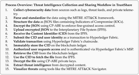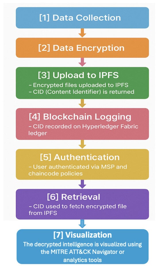 To address these gaps, we designed a framework that integrates the following technologies and standards: Hyperledger Fabric for permissioned blockchain support, Structured Threat Information eXpression (STIX) and Trusted Automated Exchange of Intelligence Information (TAXII) for standardized threat exchange, Ciphertext-Policy Attribute-Based Encryption (CP-ABE) for access control, and the Interplanetary File System (IPFS) for scalable off-chain data storage. The framework is further aligned with the MITRE ATT&CK matrix for comprehensive threat modeling.