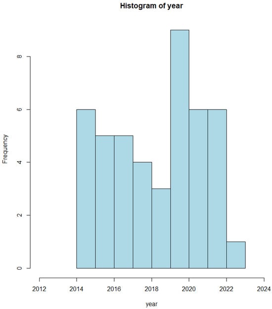 After the screening phase was completed, the resulting 45 papers were selected in order to conduct an in-depth analysis. The resulting study period spanned from 2014 to 2023, and can thus be regarded as involving novel and current research areas. It should be noted that the volume of papers on the subject has been increasing over the years, and most of the articles selected for the study were published in recent years (see