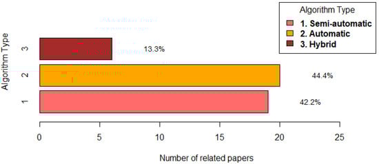 Figure 5 displays a bar plot indicating the number of semi-automatic (19), automatic (20) and hybrid (6) algorithms utilized in the analyzed studies.