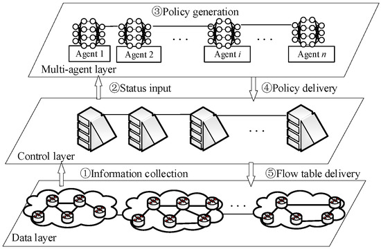 The algorithm is implemented based on the three-layer architecture of SDN. The three-layer architecture comprises the multi-agent layer, the controller layer, and the data layer from top to bottom. The multi-agent layer enables programmatic control of the network, including traffic monitoring, load balancing, and security policy implementation. Other functions are achieved through multi-agent control. Multi-agents accelerate learning by sharing knowledge and experience. The controller layer is the core of SDN architecture, which is responsible for centralized management of data layer network topology, interacts with the agent through the northbound interface to deliver the flow table, and interacts with the data layer through the southbound interface to collect data layer network topology information. The data layer includes network devices such as switches and routers, which are responsible for the actual data packet forwarding and processing. The processing flow of the architecture includes data layer information collection, status input, policy generation, policy delivery, and flow table delivery. The architecture is shown in Figure 1.