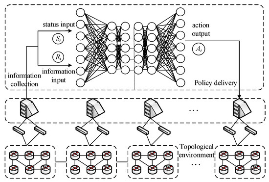Currently, researchers have conducted research on routing algorithms based on reinforcement learning and proposed a series of intelligent routing algorithm solutions. Zhao et al. [7] proposed a multi-agent reinforcement learning method for inter-domain routing, which improved the overall performance of the network. Liu et al. [8] used a comprehensive reward function, an efficient learning algorithm, and a novel deep neural network structure to learn appropriate routing strategies for different types of traffic demands. Bhavanasi et al. [6] constructed a routing reinforcement learning strategy that can operate in dynamic network conditions without retraining and compared this method with other routing protocols on various quality of service indicators. Kaviani et al. [9] proposed Deep CQ+ routing, which integrates the emerging multi-agent deep reinforcement learning technology into the existing Q-learning-based routing protocol and achieves consistently higher performance across a wide range of network topologies, demonstrating a high degree of robustness and scalability. You et al. [10] proposed a packet routing framework based on multi-agent deep reinforcement learning, which performs training and decision-making in a fully distributed environment, effectively approximates the value function of Q learning, and reduces the transmission time of packets. Ding et al. [11] used deep reinforcement learning to select routers in large-volume networks, reducing network congestion and data transmission paths, and used Markov decision processes to formulate routing problems. They designed two novel Deep Q Network (DQN)-based algorithms to reduce the probability of network congestion with shorter transmission paths. He et al. [12] proposed an effective solution to the routing optimization problem by integrating a Graph Neural Network (GNN) structure into DRL; the characteristics of GNN are used to interact with the network topology environment. Through the message-passing process of information exchange between links in the topology, available knowledge is extracted to achieve network traffic load balancing, and network performance is enhanced. Sun P et al. [13] proposed a deep reinforcement learning-based routing optimization model framework, SINET, which achieves intelligent optimization of network routing by controlling some key nodes. Chen et al. [14] proposed a scalable inter-domain multi-link routing optimization mechanism based on multi-agent reinforcement learning. The proposed mechanism dynamically adjusts inter-domain link routing by real-time sensing of traffic distribution, maximizing throughput across autonomous systems. At present, most existing elastic routing algorithms (e.g., single-agent DRL-based methods) can improve network performance under static topology, but they lack the ability to efficiently re-converge to optimal routing decisions when facing dynamic topology changes. In contrast, the ERA-MADDPG algorithm proposed in this paper introduces multi-agent collaborative learning to enhance the ‘elasticity’ of routing, defined as the capability to rapidly adapt to topology changes through real-time policy updates and inter-agent knowledge sharing.
