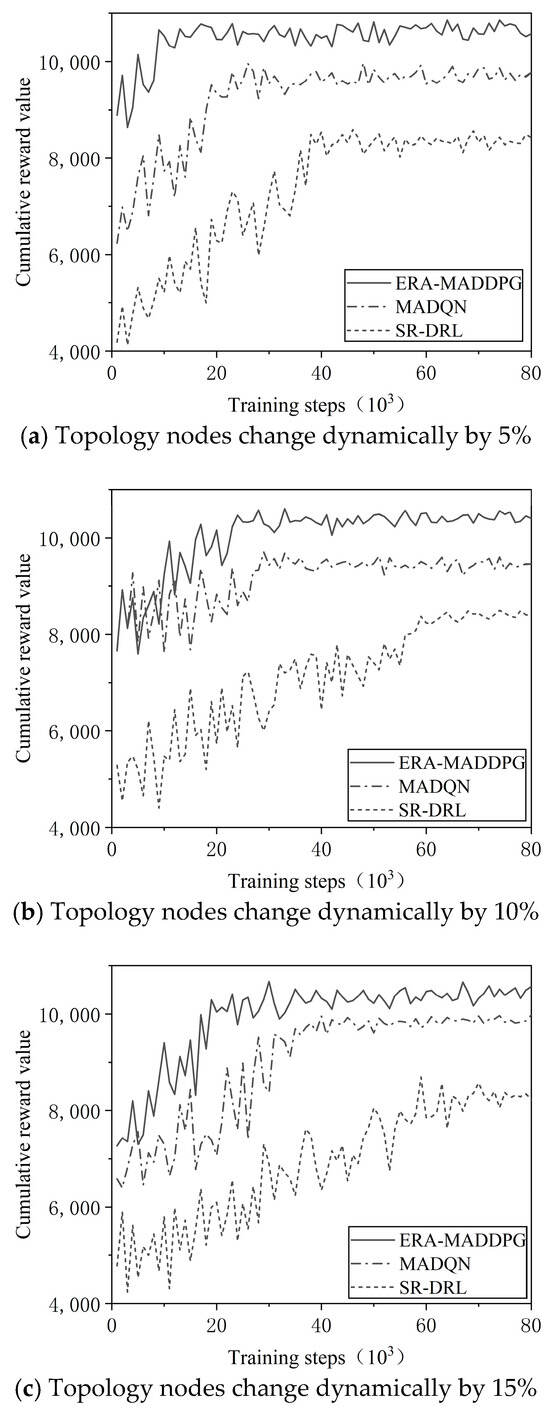 In order to verify the ability of the ERA-MADDPG algorithm to adapt to the new network environment and maintain efficient routing decision-making in the face of network changes, in this paper, the data layer network topology nodes are dynamically changed by 5%, 10%, and 15%, respectively, and then the ERA-MADDPG algorithm, MADQN algorithm, and SR-DRL algorithm are trained again. When the topological nodes change dynamically by 5%, 10%, and 15%, the training processes of the ERA-MADDPG algorithm, MADQN algorithm, and SR-DRL algorithm tend to be stable again, as shown in Figure 7a–c. When topology changes occur (e.g., 5% node failures), the algorithm initializes the retraining process with the optimal policy from the previous topology, rather than a random policy. This warm-start mechanism reduces the search space for new optimal routes, as shown in Figure 7. The comparison of convergence speed after topological node changes is shown in Table 3.