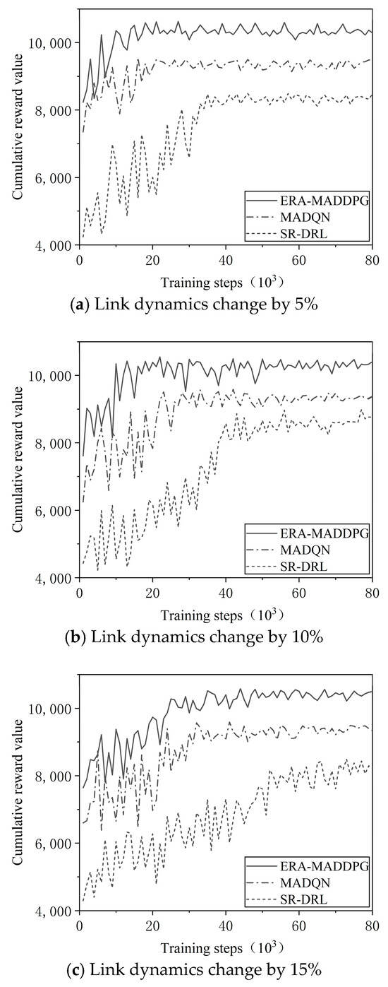 In the dynamic changes of the network, the link changes may be caused by network topology adjustments, equipment failures, or excessive link loads. When faced with link changes, it was once again verified that the ERA-MADDPG algorithm can adapt to new network environments and maintain efficient routing decision-making capabilities in the face of network changes. This paper sets the dynamic changes of links between network topology nodes to 5%, 10%, and 15%, respectively, and retrains the ERA-MADDPG algorithm, MADQN algorithm, and SR-DRL algorithm when the links between network topology nodes are dynamically changing by 5%, 10%, and 15%. Then, the results show that all three algorithms—ERA-MADDPG, MADQN, and SR-DRL—tend to stabilize again after the link changes. The training process is shown in Figure 8a–c. The comparison of convergence speed after link changes is shown in Table 4.