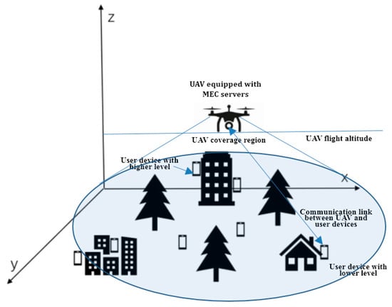 As mobile edge computing (MEC) resources are integrated into a unified resource pool and different edge facilities work together, MEC, as an important complement to edge computing, is gradually being more widely used []. Unlike traditional fixed edge nodes, MEC provides flexible computing support through mobile devices or nodes, suitable for environments with dynamic network conditions or imperfect infrastructure, especially for future 6G network integrated communication, computing, and caching (3C) [], such as intelligent transportation, augmented reality, and unmanned aerial vehicle (UAV) communication [,].