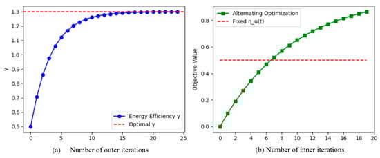 We can observe that the sequence of the objective function is non-decreasing after each alternating optimization in (b). When the number of iteration is 17, the energy efficiency of outer iteration is converged and bounded in (a). According to the monotonic bounded theorem, Algorithm 1 must converge.