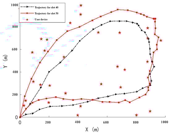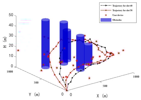 By conducting comparative experiments with different flight time slots, the motion of the UAV in 3D space (Figure 3) and its 2D projection (Figure 4) were plotted for the number of user devices.