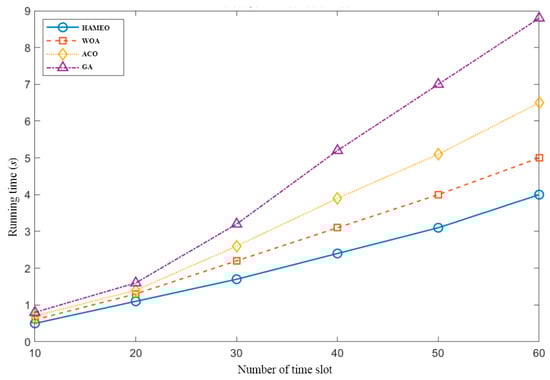 Figure 5 shows the running time required for each algorithm to achieve a stable UAV trajectory for the first time at different time slots. When the number of time slots was small, there was not much difference in the time consumption of each algorithm. As the number of slots increased, the time consumption of the GA and WOA increased rapidly, while the ACO algorithm grew slowly, and the overall time consumption of the APO algorithm remained relatively low.