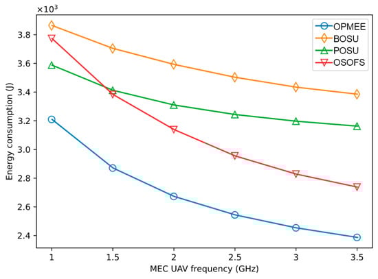 As shown in Figure 6, the energy consumption of the UAV-assisted MEC system changes with the enhancement of UAV performance. Among them, the BOSU and POSU schemes have higher energy consumption, while the OSOFS and OPMEE schemes have lower energy consumption. With the enhancement of UAV-assisted MEC system performance, the energy consumption reduction of the OPMEE scheme proposed in this paper is more significant. The performance of UAV-assisted MEC systems can affect the trajectory and hovering time of UAVs, thereby affecting the total energy consumption, by affecting the computation delay of tasks. In BOSU and POSU schemes, due to the lack of trajectory optimization capability, UAVs have more wasteful trajectories, thereby increasing energy consumption. In addition, due to their excellent trajectory optimization capabilities and the ability to partition time slots and tasks more finely, the OSOFS and OPMEE schemes make more efficient use of edge network resources, resulting in lower energy consumption.