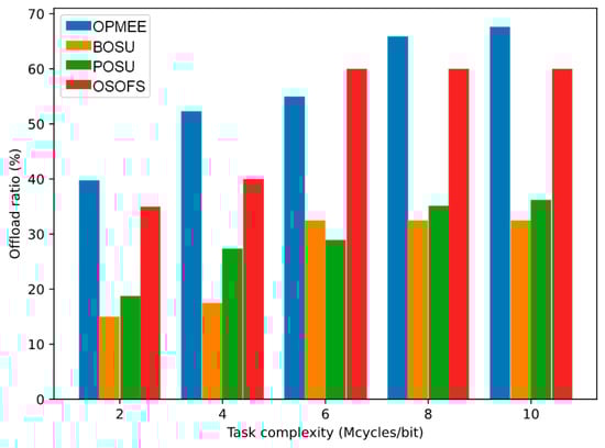 Figure 7 shows the trend of task offloading ratio as task complexity increases. The offloading ratio of the four task offloading schemes increases with the increase in task complexity, but the offloading ratio of BOSU and POSU schemes is significantly lower than that of OSOFS and OPMEE schemes. Therefore, whether the scheme has trajectory optimization is very important. When the complexity of tasks increases, in order to reduce energy consumption, user devices tend to migrate more tasks to UAV-assisted MEC. In the OSOFS and OPMEE schemes, UAV-assisted MEC performs task offloading and computation along optimized trajectories, thus increasing the task offloading ratio. The task offloading cost in BOSU and POSU schemes is relatively high, so the offloading ratio is lower than that in OSOFS and OPMEE schemes. Note that when task complexity increases 6, the offloading rate of OSOFS is bigger than OPMEE. We point out that OPMEE offloads as many tasks as possible to save energy consumption in the initial stage for saving energy consumption. When the task complexity reaches a certain level, such as 6, in order to balance energy consumption and optimize flight trajectories, the number of offloading tasks may be reduced. After that, a higher offloading ratio is recovered. That is to say, the algorithm will choose a balancing strategy between energy consumption and trajectory optimization.