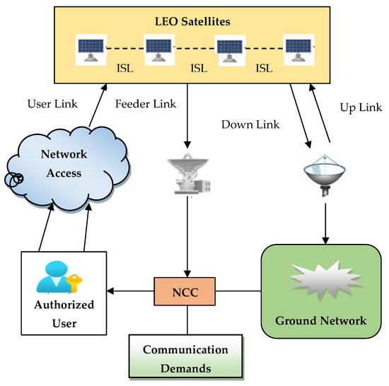 The proposed LEO satellite network architecture for MRFCO ZTS comprises four primary components: (1) a centralized Network Control Center (NCC) managing satellite operations and user access, (2) an authorized user segment with terminals such as VSATs and GPS receivers, (3) a constellation of LEO satellites (including both inter-satellite and ground feeder links), and (4) communication links, encompassing uplink/downlink paths between users and satellites as well as inter-satellite and feeder links, which have been shown in Figure 1.