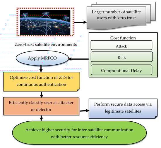 As presented in the above diagram, the MRFCO-ZTS approach initially considers zero-trust satellite networks with many satellite users. Then, the MRFCO-ZTS approach generates the cost function of ZTS by considering multiple factors, including attack likelihood, cumulative user risk, and computational delay. Subsequently, the MRFCO-ZTS approach utilizes Manta Ray Foraging Optimization (MRFO) to optimize the cost function of ZTS for continuous user verification with better resource efficiency. As a result, the MRFCO-ZTS approach can provide stronger security for data communication in satellite environments by finding honest and attack users in satellite networks via classification.